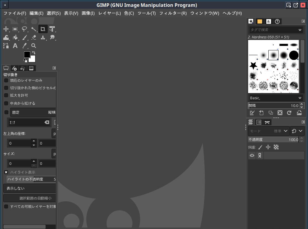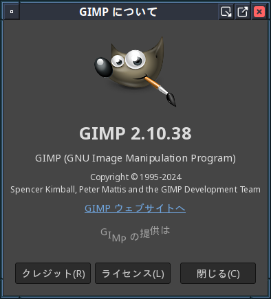 起動直後の状態です。 2024年9月6日の時点で、下記のバージョンでした。 操作については、「画像編集ソフト GIMP2」に掲載しています。 上記は簡単なものですので、詳細なものがほしい方は、各所に初歩の手引きから応用編までありますので、そちらを参考にしてください。 |