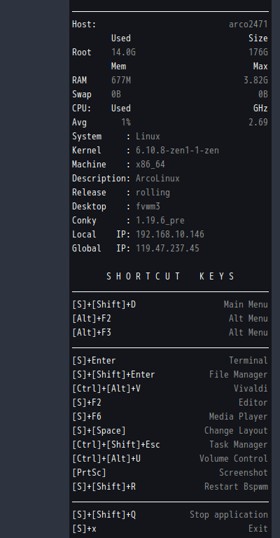 ショートカットキー表示の前に、「システム情報」「ディストリビューション」「デスクトップ」「Conky バージョン情報」「IP アドレス」を複数行で表示します。