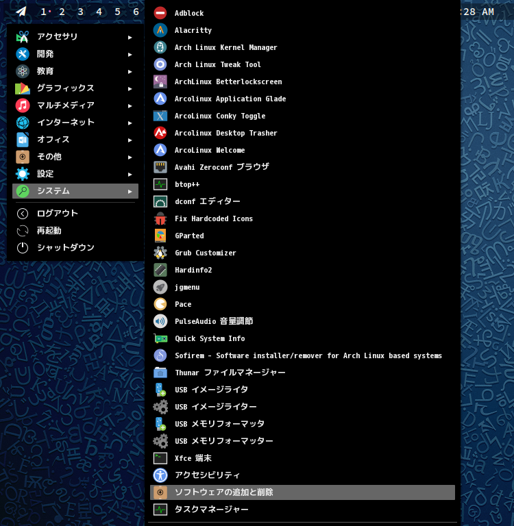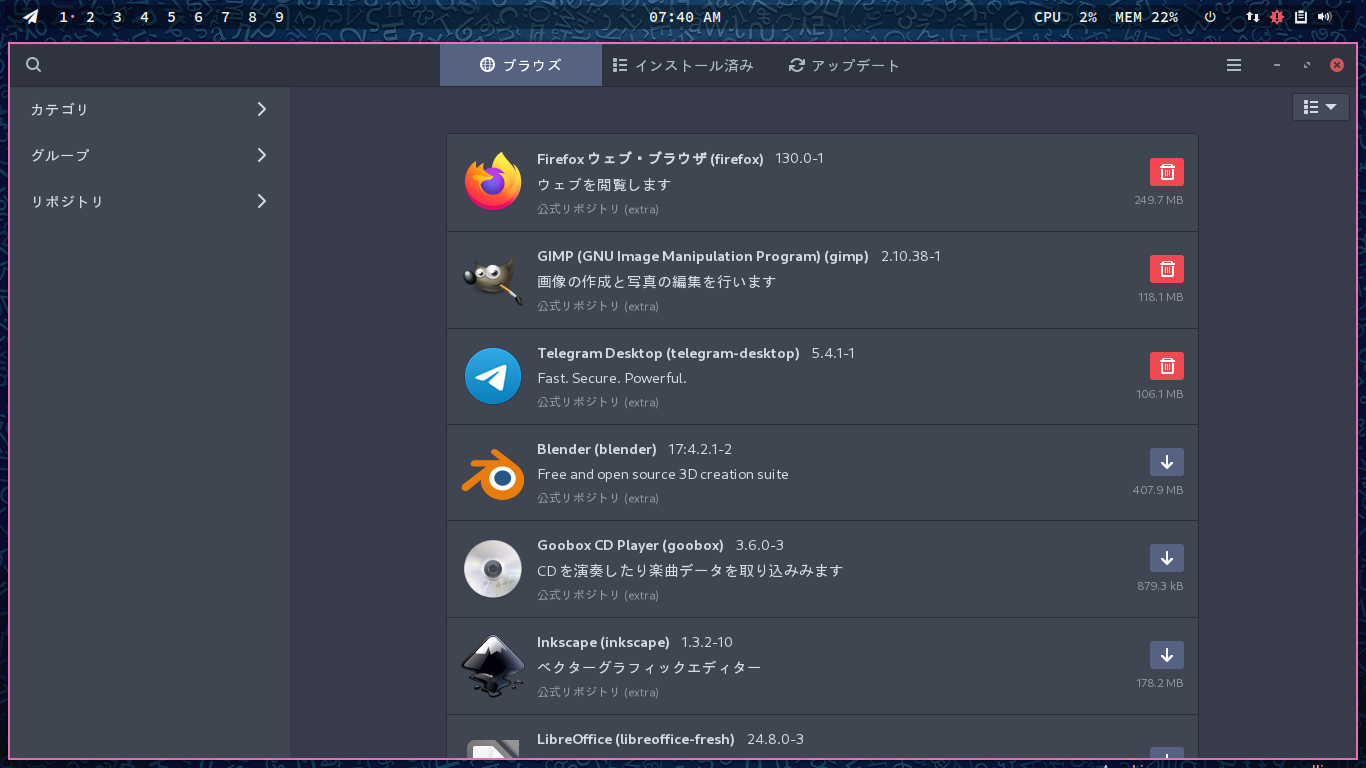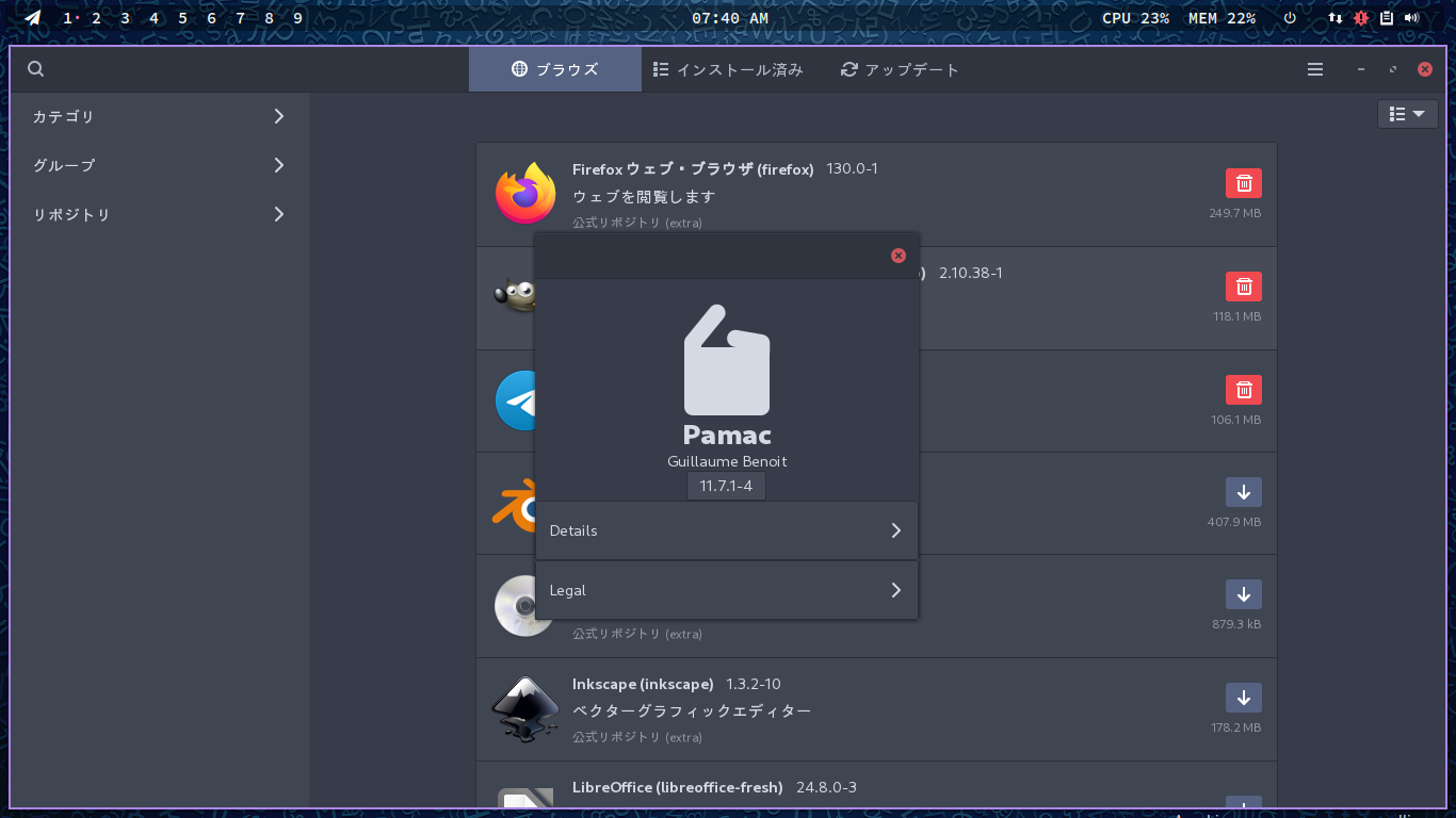 1. 概要 パッケージ管理フロントエンドとして「Pamac」を使用します。 2. インストール 「root」ユーザ権限で。 yes | pacman -S pamac-aur 3. 起動 「スタート」→「システム」→「ソフトウェアの追加と削除」
