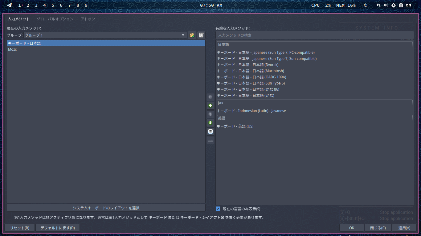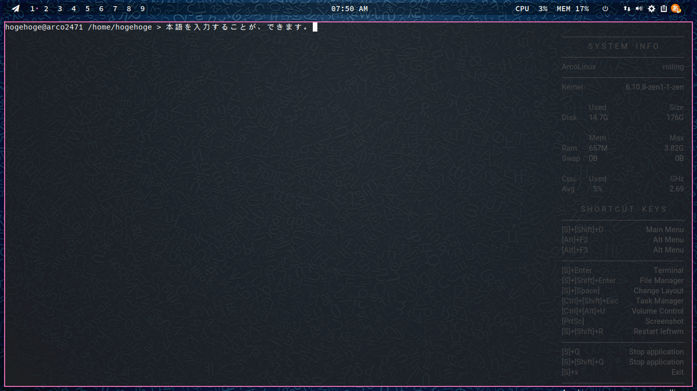 日本語入力として、「fcitx5-mozc」をインストールして使用します。