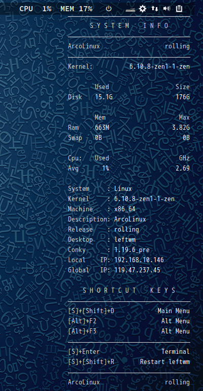 ショートカットキー表示の前に、「システム情報」「ディストリビューション」「デスクトップ」「Conky バージョン情報」「IP アドレス」を複数行で表示します。