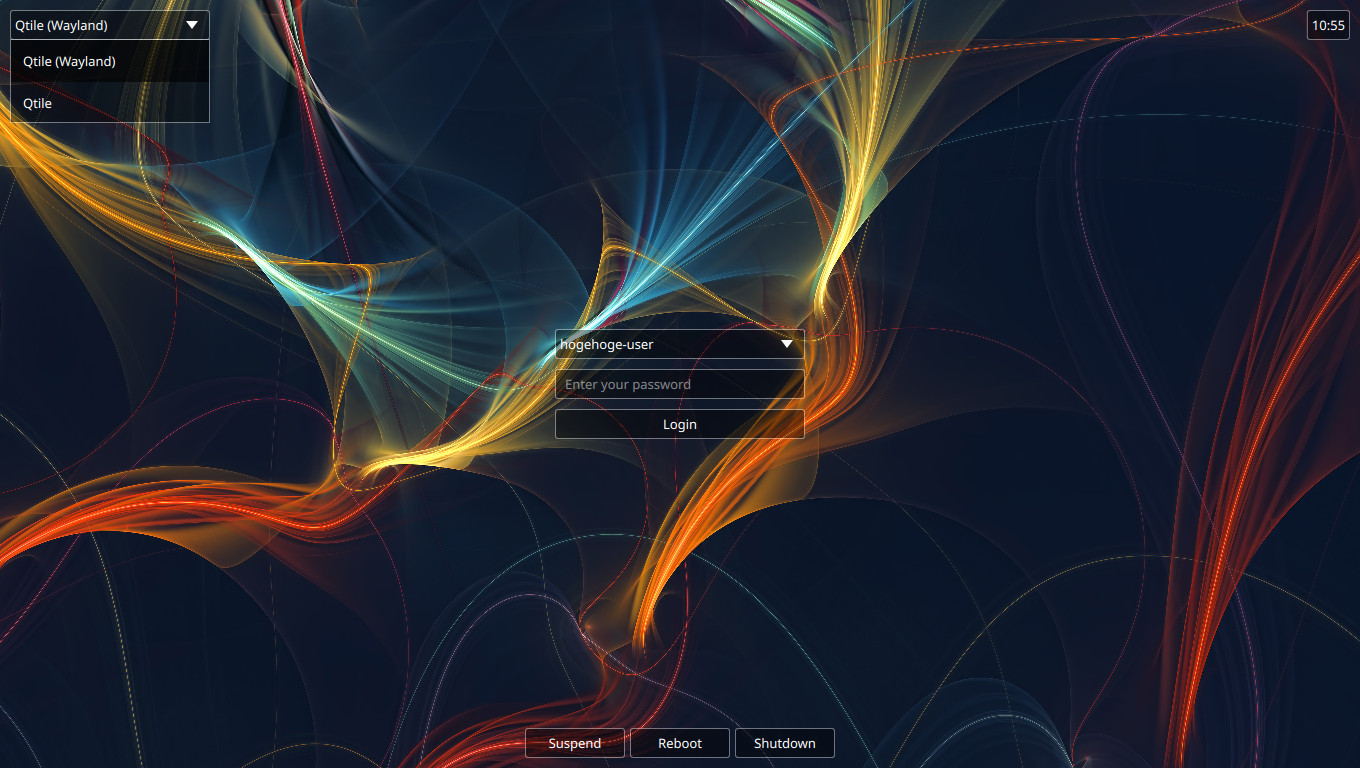 ログイン画面が表示されれば、インストールは、完了です。 デフォルトでは、「Qtile(Wayland)」が選択されていますが、「VirtualBox」上であれば、これはログインしても何も操作できない状況になります。 「qtile」の方に切り替えて、ログインします。 |