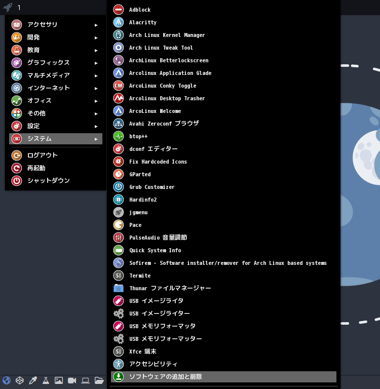 1. 概要 パッケージ管理フロントエンドとして「Pamac」を使用します。 2. インストール 「root」ユーザ権限で。 yes | pacman -S pamac-aur 3. 起動 「スタート」→「システム」→「ソフトウェアの追加と削除」 (前ページの後、再起動したら、アイコンが変わっちゃいました)