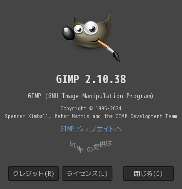起動直後の状態です。 2024年9月9日の時点で、下記のバージョンでした。 操作については、「画像編集ソフト GIMP2」に掲載しています。 上記は簡単なものですので、詳細なものがほしい方は、各所に初歩の手引きから応用編までありますので、そちらを参考にしてください。 |