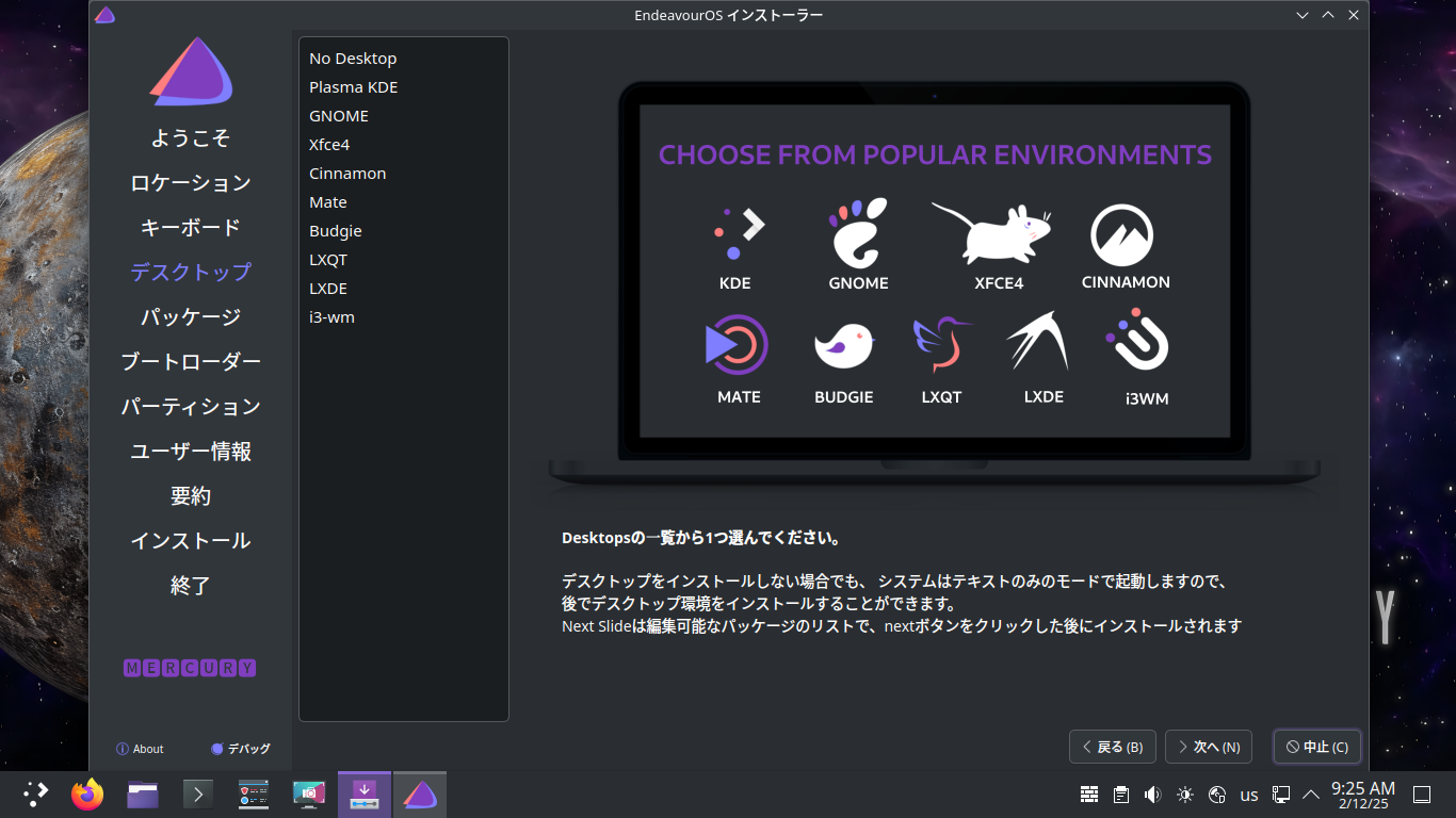 「Offline」を選ぶと、一択で「KDE」のみのインストールとなりますが