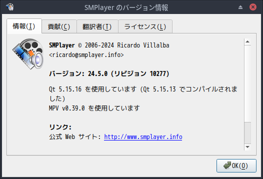 起動直後の状態です。 ビデオコンテンツを再生してみました。 快適に再生できます。 2025年2月12日の時点で、下記のバージョンでした。 |