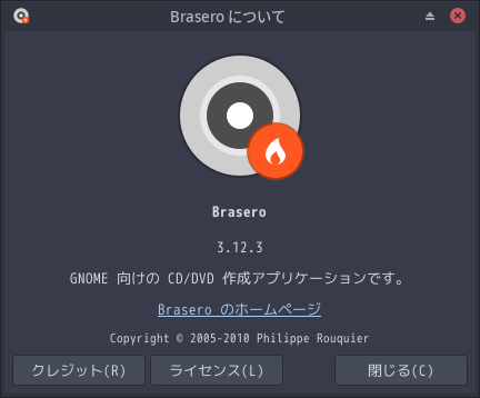 1. 概要 光ディスク(CD・DVD)のライティングソフトとして、「Brasero」を使用します。 2. インストール 端末を開いて、「root」ユーザ権限で。 yes | pacman -S brasero 3. 起動 「スタート」→「マルチメディア」→「Brasero」