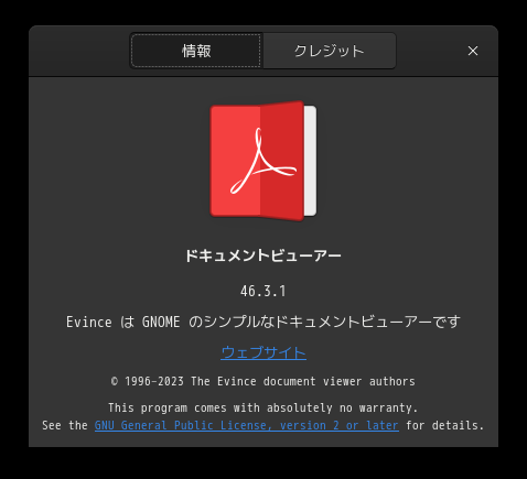 起動直後の状態です。 「.pdf」ファイルを開いてみました。 日本語も正常に表示されます。 2025年2月14日の時点で、下記のバージョンでした。 |