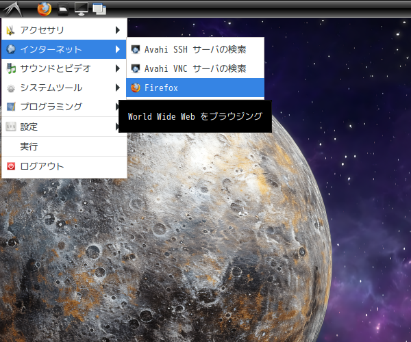 1. 概要 ブラウザとして、「Firefox」がデフォルトでインストールされ、日本語化されています。 2. 起動 「スタート」→「インターネット」→「Firefox」