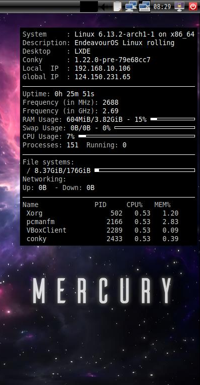 ログイン後に、デスクトップ右に、「Conky」の表示が現れます。