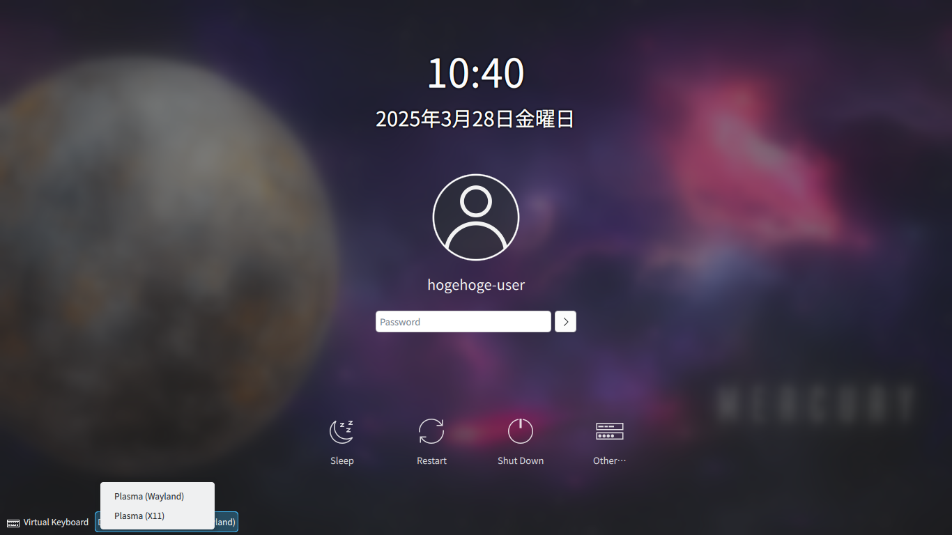 デスクトップに、「Wayland」と「X11」の選択肢があります。 「VirtualBox」上へインストールしている場合は、「X11」の方で、ログインします。 「Wayland」へログインする場合は、グラフィックスコントローラの設定を「3D Disable」にしないと文字化けが発生します。 |