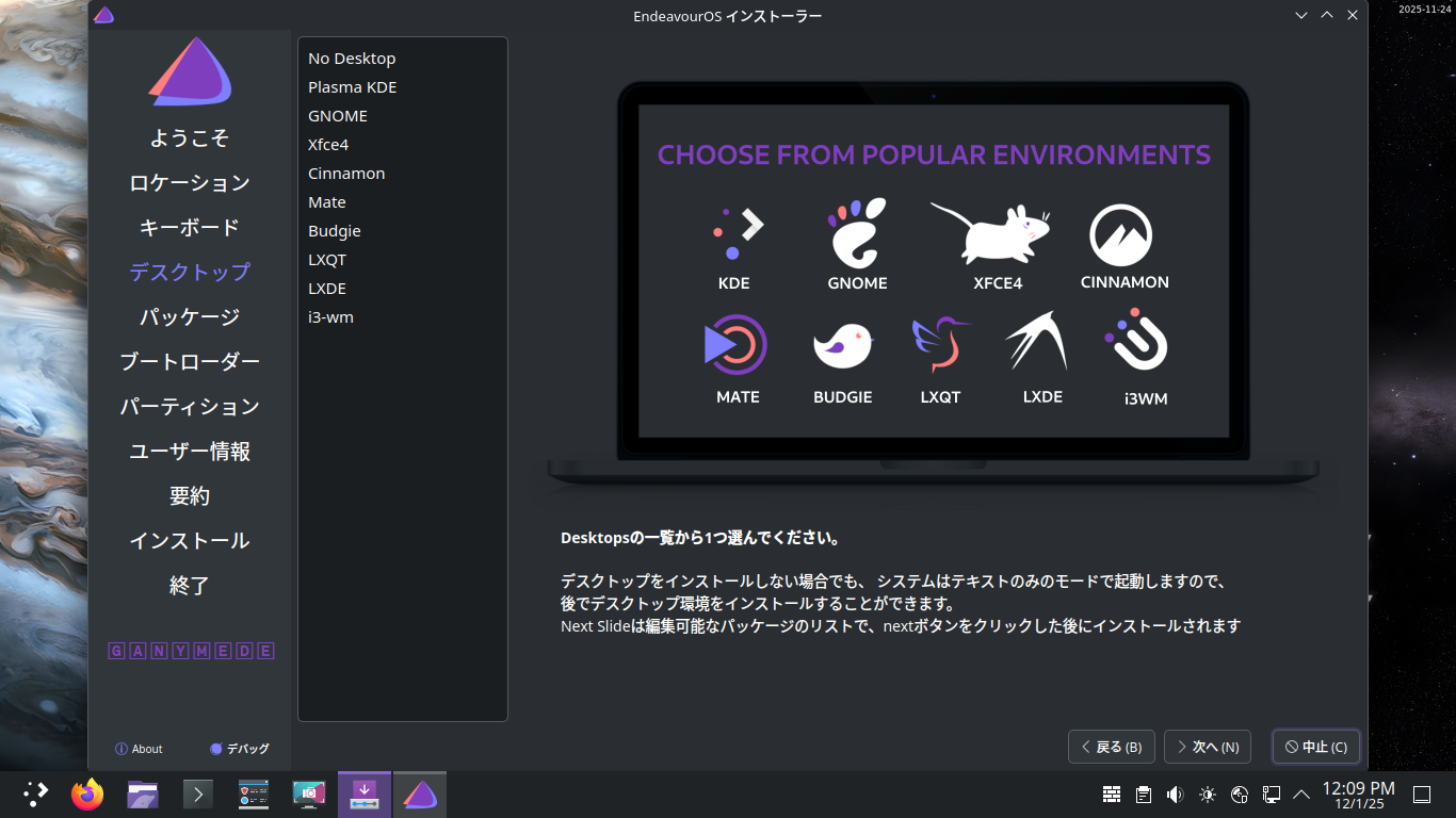 「Offline」を選ぶと、一択で「KDE」のみのインストールとなりますが