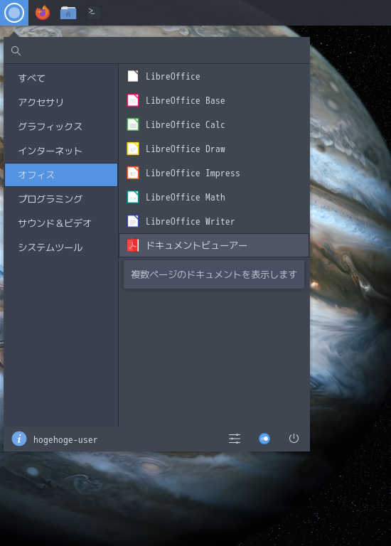 1. 概要 ドキュメントビューアとして、「Evince」を使用します。 「Evince」は、デフォルトでインストールされています。 「Xreader」もインストールされていますが、「Evince」の方を使うことにします。 2. 起動 「スタート」→「オフィス」→「ドキュメントビューア」