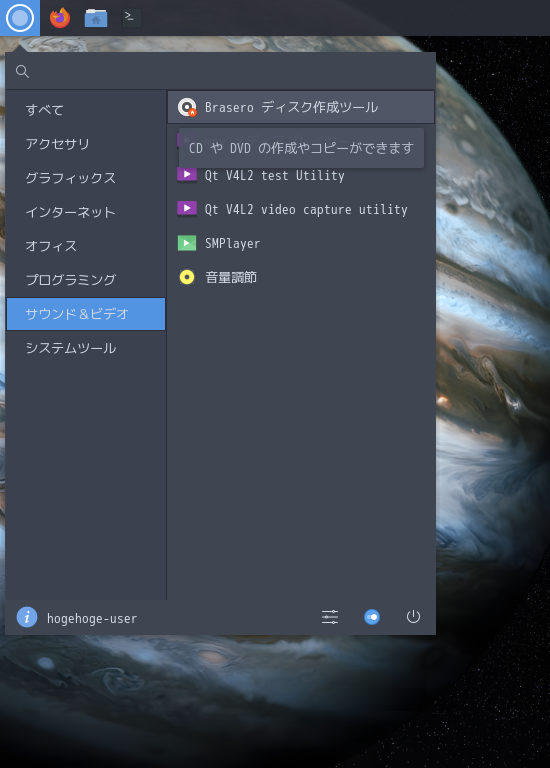 1. 概要 光ディスク(CD・DVD)のライティングソフトとして、「Brasero」を使用します。 2. インストール 「root」ユーザ権限で。 yes | pacman -S brasero 3. 起動 「スタート」→「サウンドとビデオ」→「Brasero」