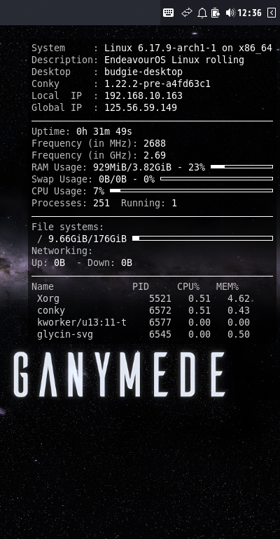 再ログイン後に、デスクトップ右に、「Conky」の表示が現れます。