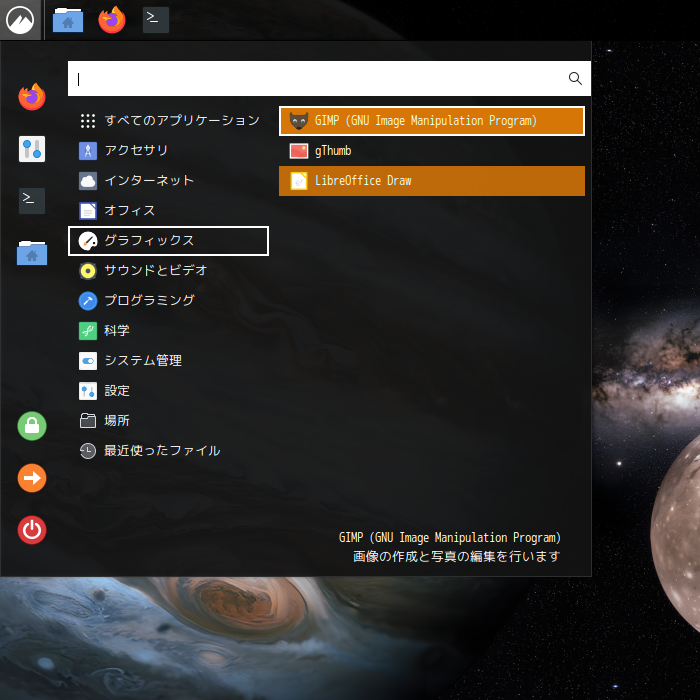 1. 概要 画像編集ソフトとして、「GIMP」を使用します。 2. インストール 「root」ユーザ権限で。 yes | pacman -S gimp 3. 起動 「スタート」→「グラフィックス」→「GIMP」