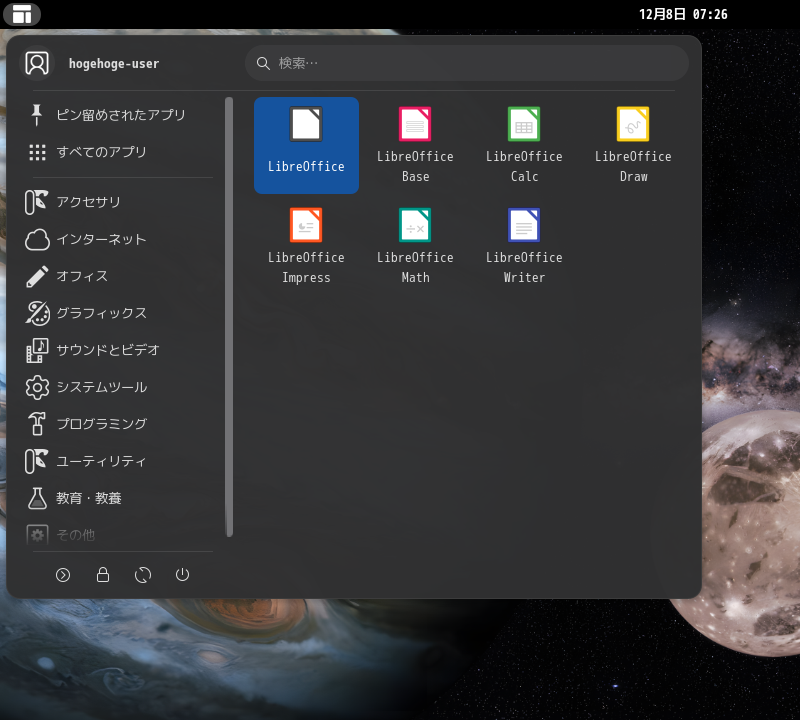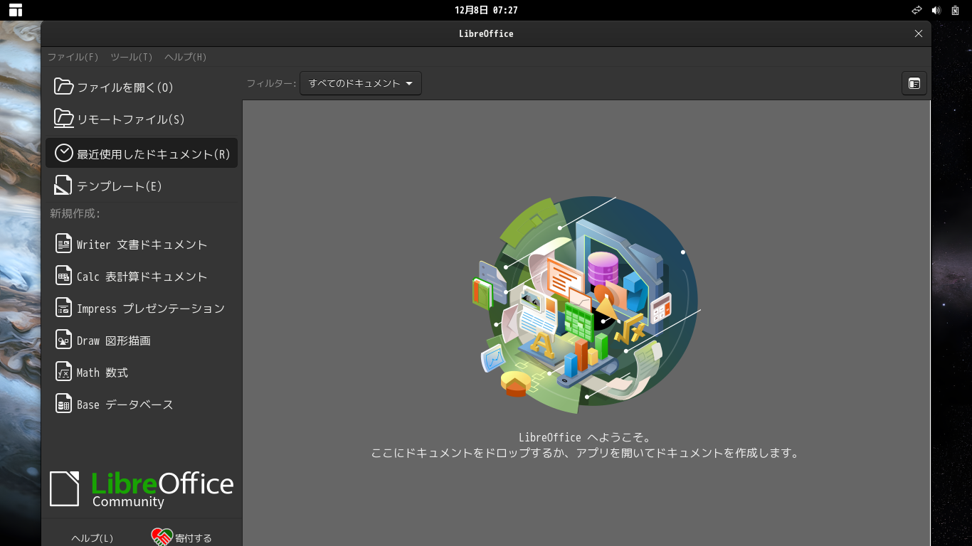 1. 概要 オフィススイートとして、「LibreOffice」を使用します。 2. インストール 「root」ユーザ権限で。 yes | pacman -S libreoffice-still-ja 3. 起動 「スタート」→「オフィス」→「LibreOffice」