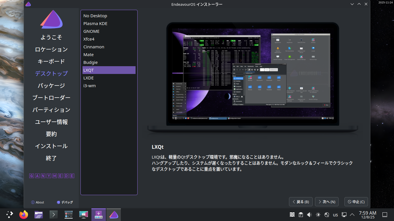 1. 概要 インストールに関しては、「EndeavourOS - 2025.11.24 - 共通事項」をご参照ください。 2. インストール インストール時のデスクトップ選択で、「LXQt」にチェックをいれることで、「LXQt」をインストールできます。
