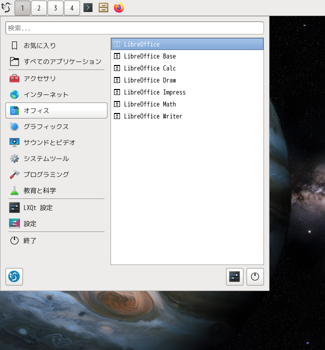 「LibreOffice」のみ、「Welcome」画面よりインストールできますが、後で、日本語化パッケージをインストールする必要があるので、はなから「pacman」でインストールします。