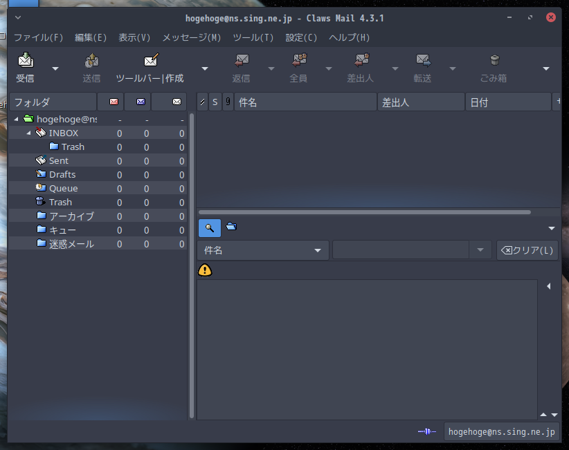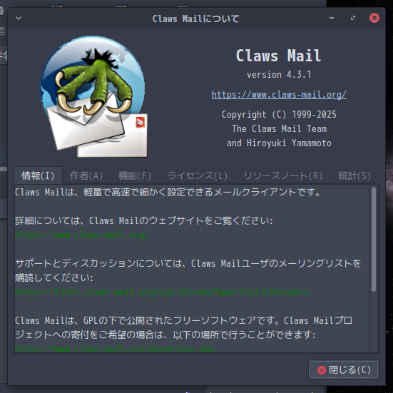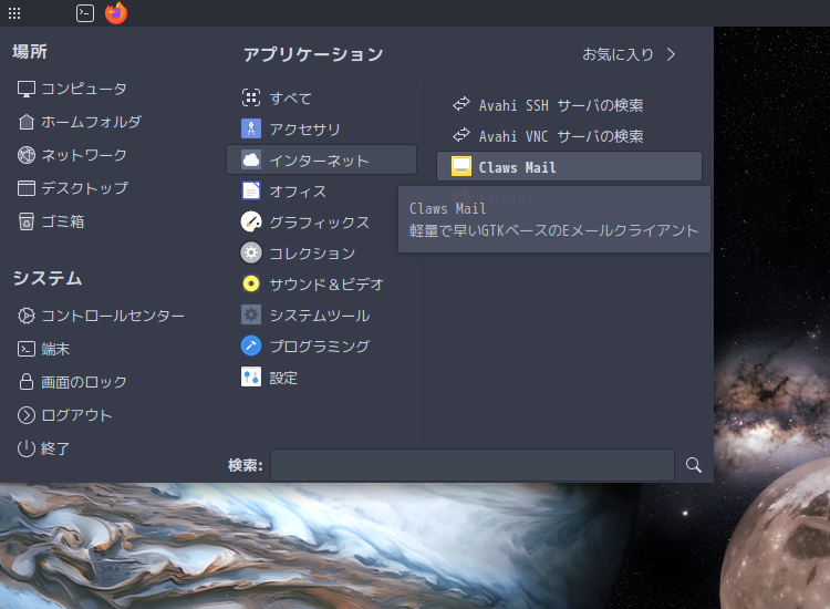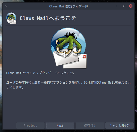デフォルトでは、メールクライアントは、インストールされていません。  「Claws Mail」をインストールして、使用します。