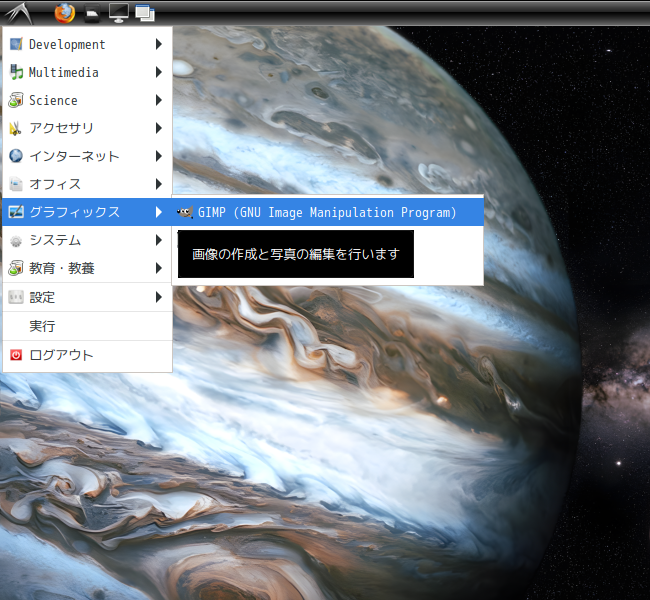 1. 概要 画像編集ソフトとして、「GIMP」を使用します。 2. インストール 「root」ユーザ権限で。 yes | pacman -S gimp 3. 起動 「スタート」→「グラフィックス」→「GIMP」