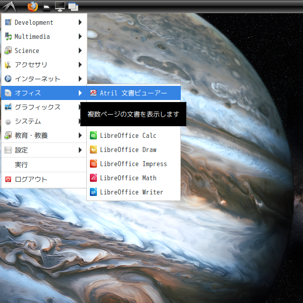 1. 概要 ドキュメントビューアとして、「Atril」を使用します。 2. インストール 「root」ユーザ権限で。 yes | pacman -S atril 3. 起動 「スタート」→「オフィス」→「Atril」