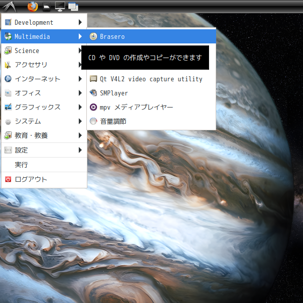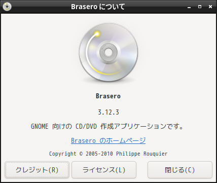 1. 概要 光ディスク(CD・DVD)のライティングソフトとして、「Brasero」を使用します。 2. インストール 「root」ユーザ権限で。 yes | pacman -S brasero 3. 起動 「スタート」→「Mulitimedia」→「Brasero」