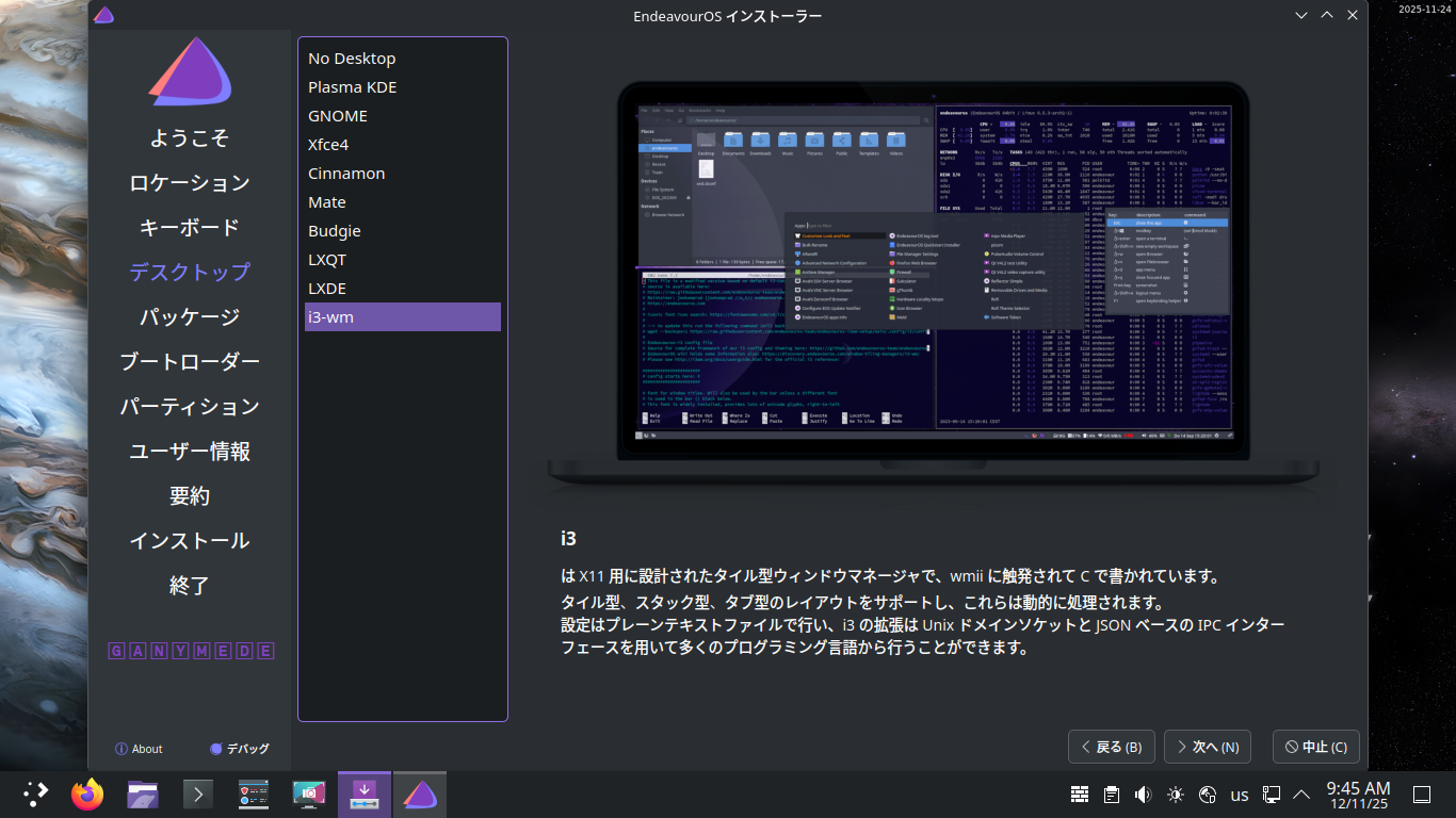 1. 概要 「i3wm」をインストールします。 2. インストール インストールに関しては、「EndeavourOS - 2025.11.24 - 共通事項 - インストール」をご参照ください。 インストール時のデスクトップ選択で、「i3-wm」にチェックをいれることで、「i3wm」をインストールできます。