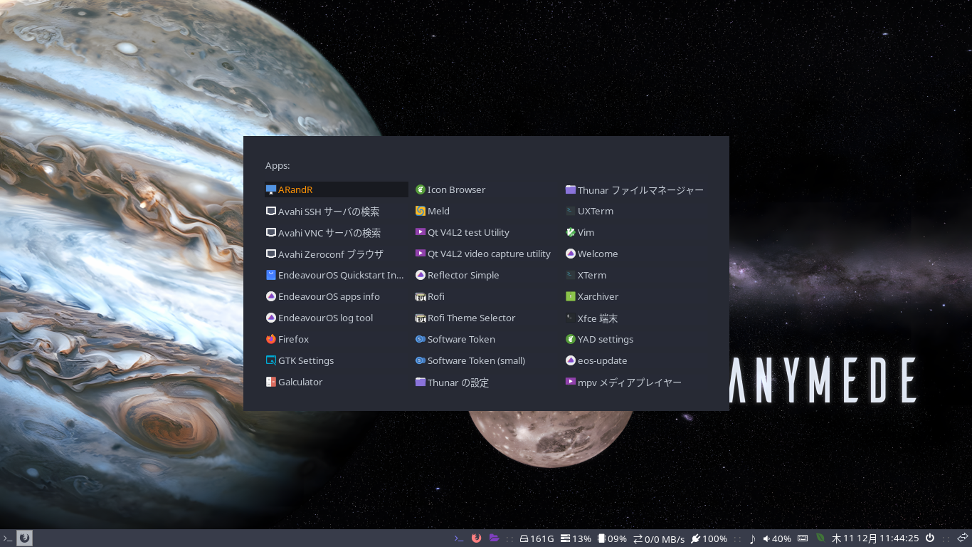 デフォルトのデスクトップに mod+d で、「rofi -modi drun」を中央に表示した状態です。