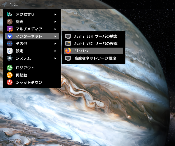 ブラウザとして、「Firefox」がデフォルトでインストールされ、日本語化されています。