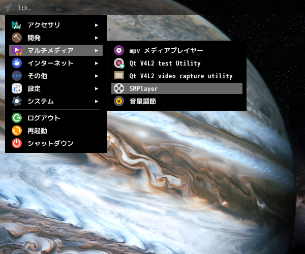 1. 概要 マルチメディアプレイヤーとして、「SMPlayer」を使用します。 2. インストール 「root」ユーザ権限で。 yes | pacman -S smplayer 3. 起動 「スタート」→「マルチメディア」→「SMPlayer」