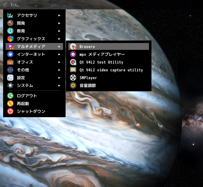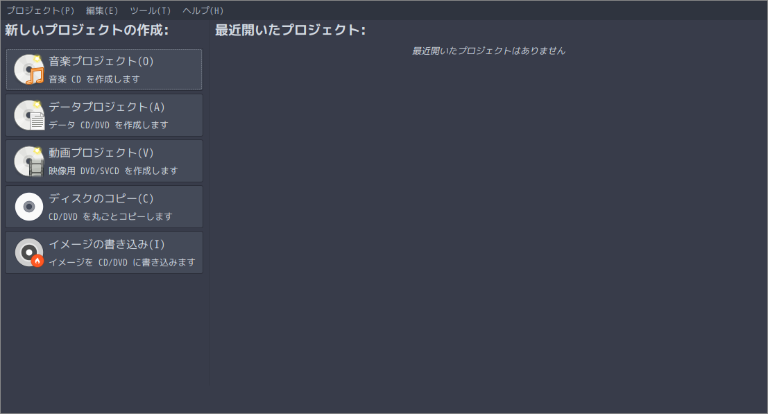 1. 概要 光ディスク(CD・DVD)のライティングソフトとして、「Brasero」を使用します。 2. インストール 「root」ユーザ権限で。 yes | pacman -S brasero 3. 起動 「スタート」→「マルチメディア」→「Brasero」