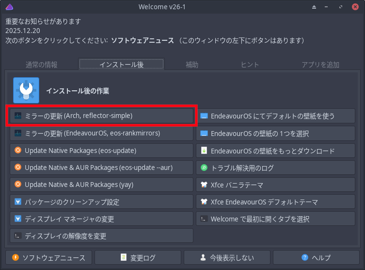 あらかじめ、リポジトリを更新し、アップグレードしておきます。
