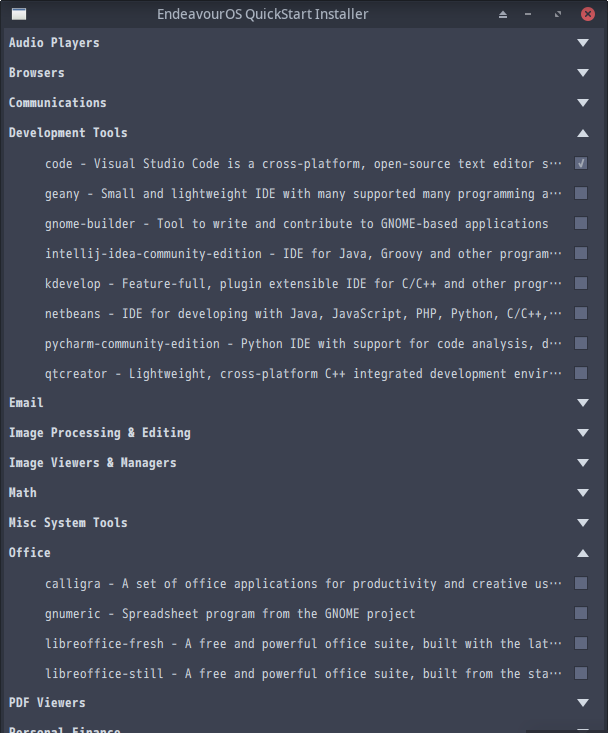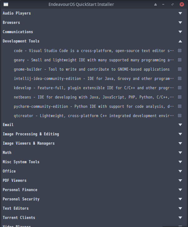 カテゴリを開きます。 ここでは、試しに「Development Tools」を開いてみます。。 チェックして、「Install Now」で、インストールできるようです。 「Visual Studio Code」は、ここにあるようです。 (ただし、これでインストールするのは「Code OSS」になります、これは、インストールしないように) しかしまぁ、カテゴリを探すのも大変です。 なのでわたしは。「root」ユーザ権限で、「pacman」を使用して、パッケージを管理します。 「pacman」の使用方法に関しては、「パッケージ管理 - Arch 系 pacman」をご参照ください。 |