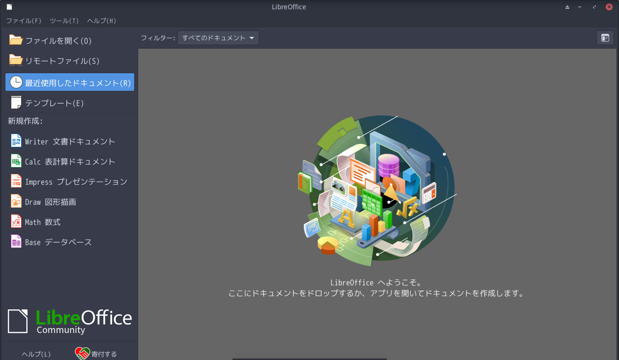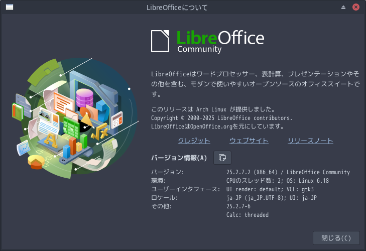 1. 概要 オフィススイートとして、「LibreOffice」を使用します。 2. インストール 「root」ユーザ権限で。 yes | pacman -S libreoffice-still-ja 3. 起動 「スタート」→「オフィス」→「LibreOffice」