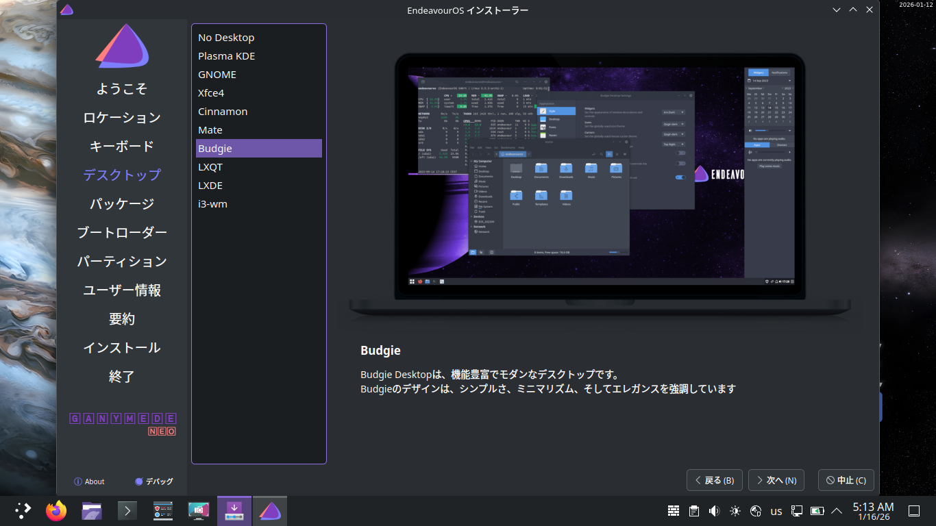 EndeavourOS - 2026.01.12 - BUDGIE - インストール
