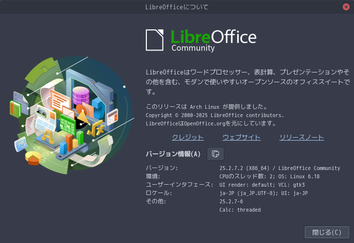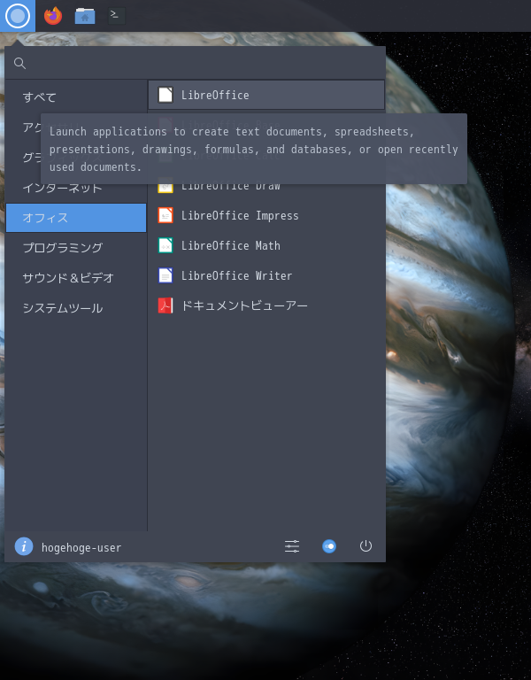 「LibreOffice」のみ、「Welcome」画面よりインストールできますが、後で、日本語化パッケージをインストールする必要があるので、はなから「pacman」でインストールします。