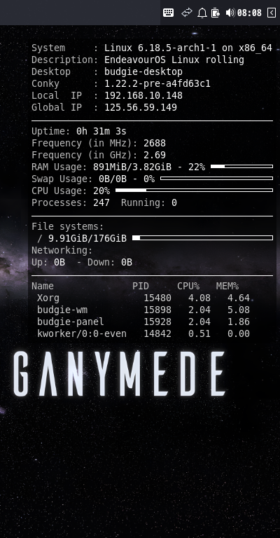 再ログイン後に、デスクトップ右に、「Conky」の表示が現れます。
