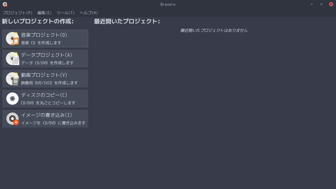 1. 概要 光ディスク(CD・DVD)のライティングソフトとして、「Brasero」を使用します。 2. インストール 「root」ユーザ権限で yes | pacman -S brasero 3. 起動 「スタート」→「サウンドとビデオ」→「Brasero」