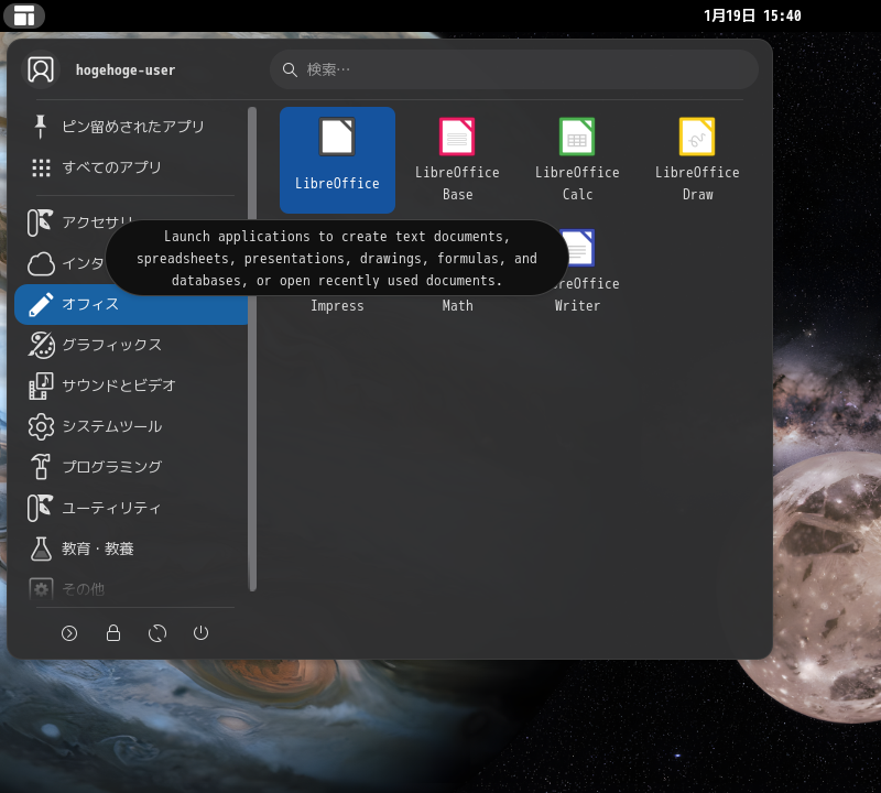 1. 概要 オフィススイートとして、「LibreOffice」を使用します。 2. インストール 「root」ユーザ権限で。 yes | pacman -S libreoffice-still-ja 3. 起動 「スタート」→「オフィス」→「LibreOffice」