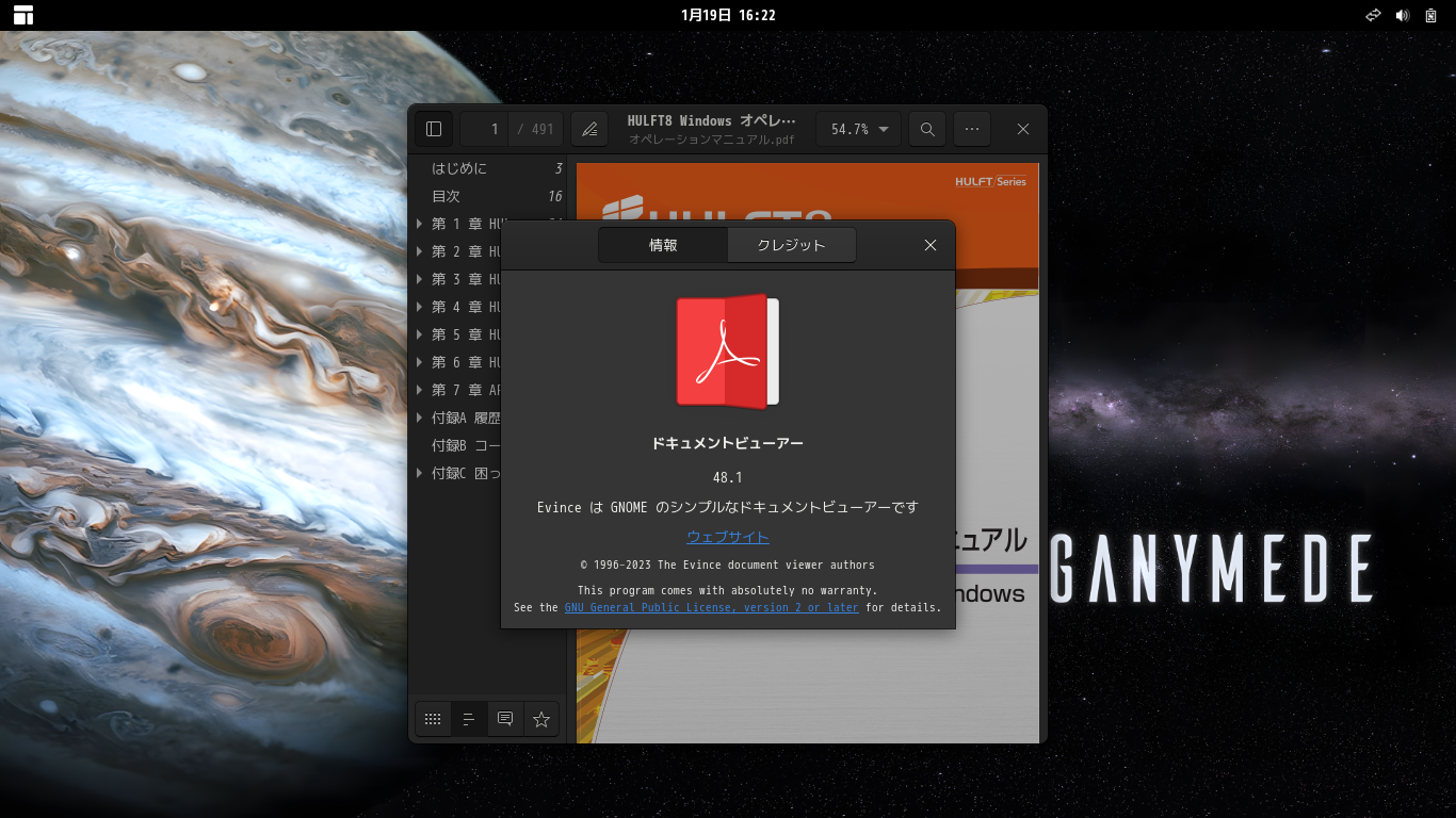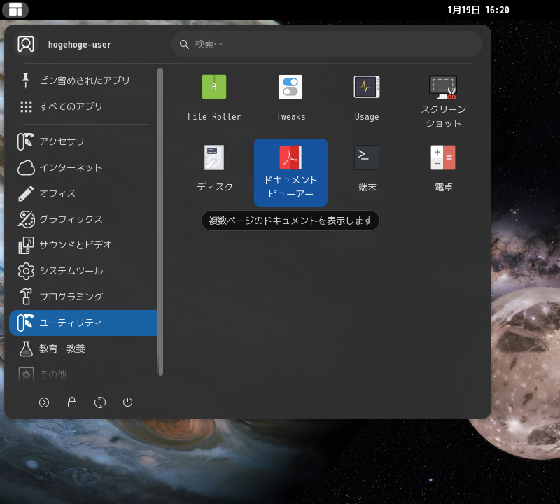 1. 概要 ドキュメントビューアとして、「Evince」を使用します。 「Evince」は、「GNOME」のドキュメントビューアです。 デフォルトで、インストールされています。 2. 起動 「スタート」→「ユーティリティ」→「ドキュメントビューア」