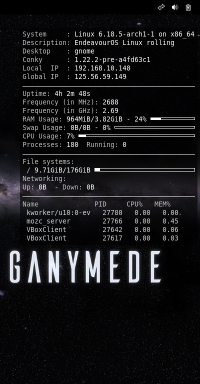 ログイン後に、デスクトップ右に、「Conky」の表示が現れます。