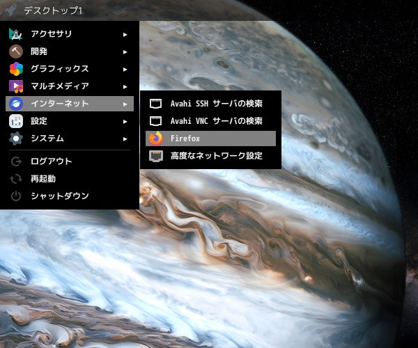 1. 概要 ブラウザとして、「Firefox」がデフォルトでインストールされ、日本語化されています。 「Firefox」の操作に関しては、「ブラウザ - Firefox」をご参照ください。 2. 起動 「スタート」→「インターネット」→「Firefox」