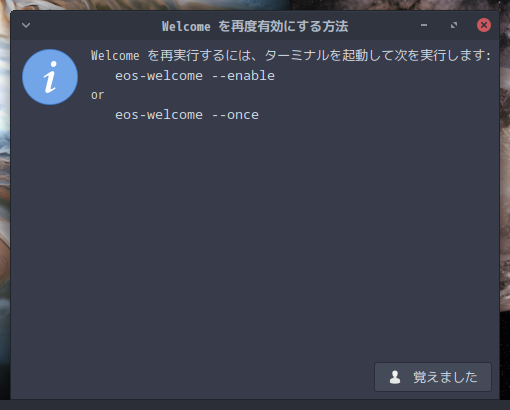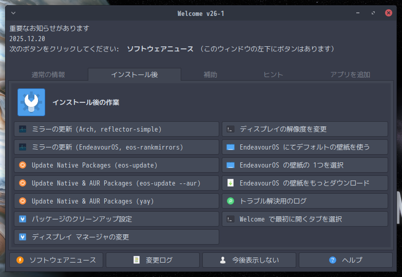 「EndeavourOS 2026.01.12」の共通的な操作に関しては、「EndeavourOS - 2026.01.12 - 共通事項」をご参照ください。