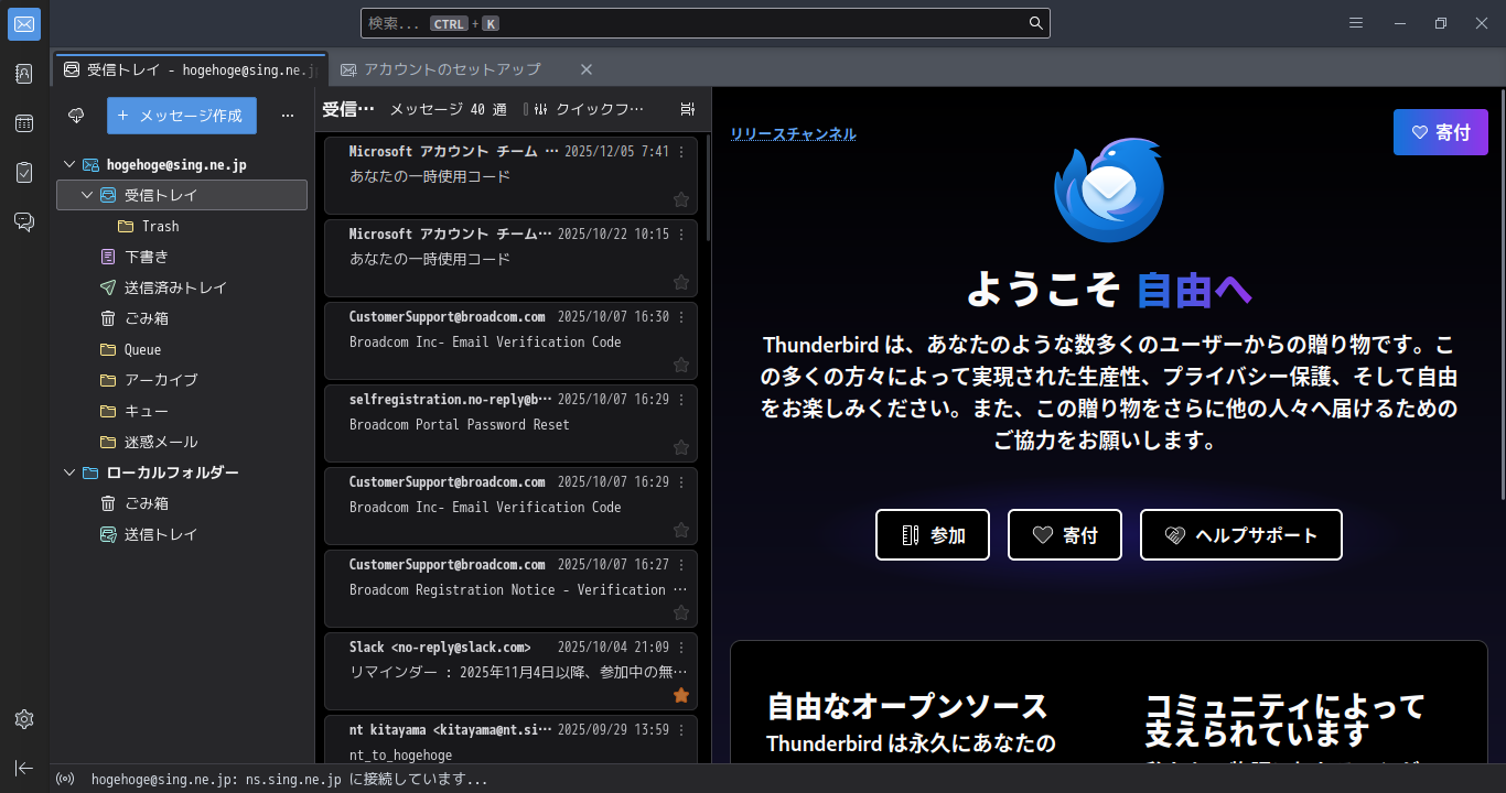 1. 概要 デフォルトでは、メールクライアントは、インストールされていません。 「Thunderbird」をインストールして、使用します。 「メールアアドレスのセットアップ」他、操作については、「メール クライアント ソフト - Thunderbird」をご参照ください。 2. インストール 「root」ユーザ権限で。 yes | pacman -S thunderbird-i18n-ja 3. 起動 「スタート」→「インターネット」→「Thunderbird」