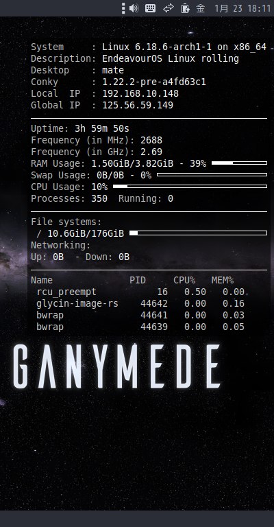 再ログイン後に、デスクトップ右に、「Conky」の表示が現れます。