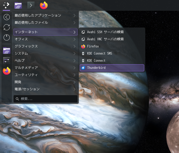 1. 概要 デフォルトでは、メールクライアントは、インストールされていません。 「Thunderbird」をインストールして、使用します。 「メールアアドレスのセットアップ」他、操作については、「メール クライアント ソフト - Thunderbird」をご参照ください。 2. インストール 「root」ユーザ権限で。 yes | pacman -S thunderbird-i18n-ja 3. 起動 「スタート」→「インターネット」→「Thunderbird」