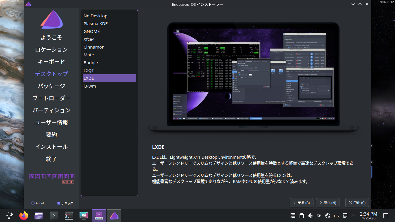 1. 概要 デスクトップ環境として、「LXDE」をインストールします。 2. インストール インストールに関しては、「EndeavourOS - 2026.01.12 - 共通事項」をご参照ください。 インストール時のデスクトップ選択で、「LXDE」にチェックをいれることで、「LXDE」をインストールできます。