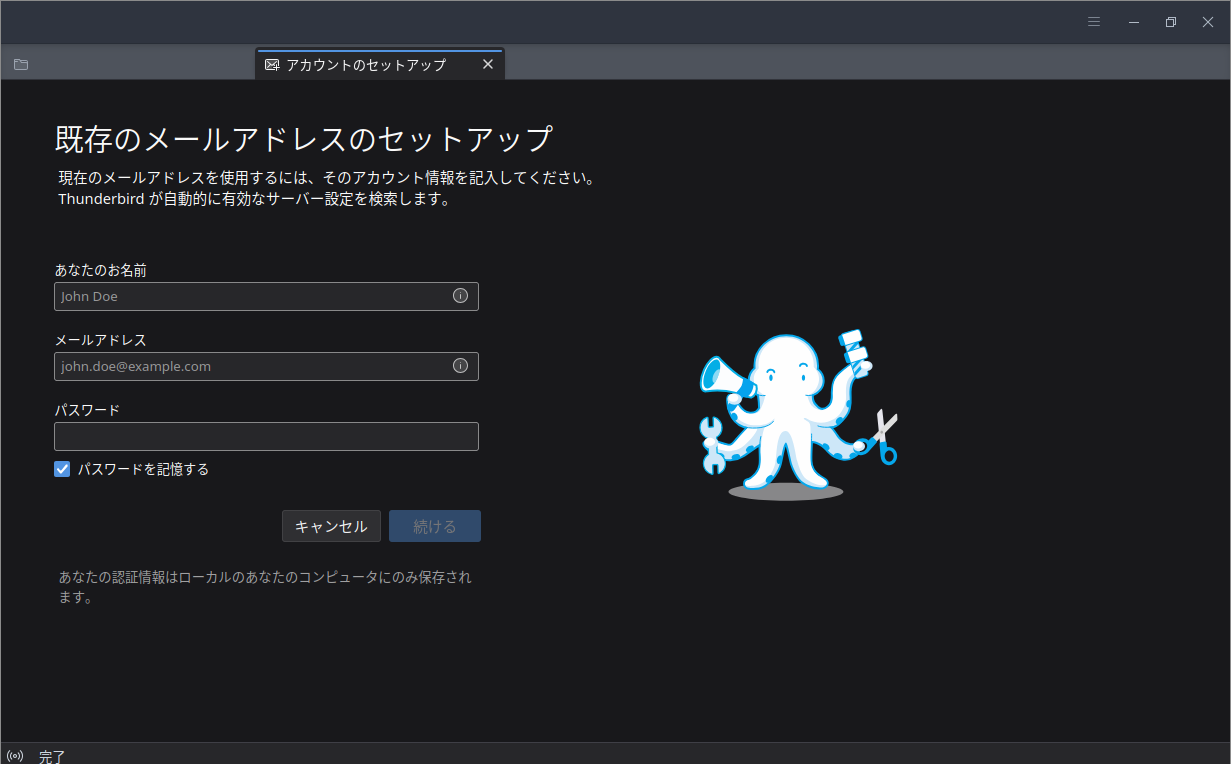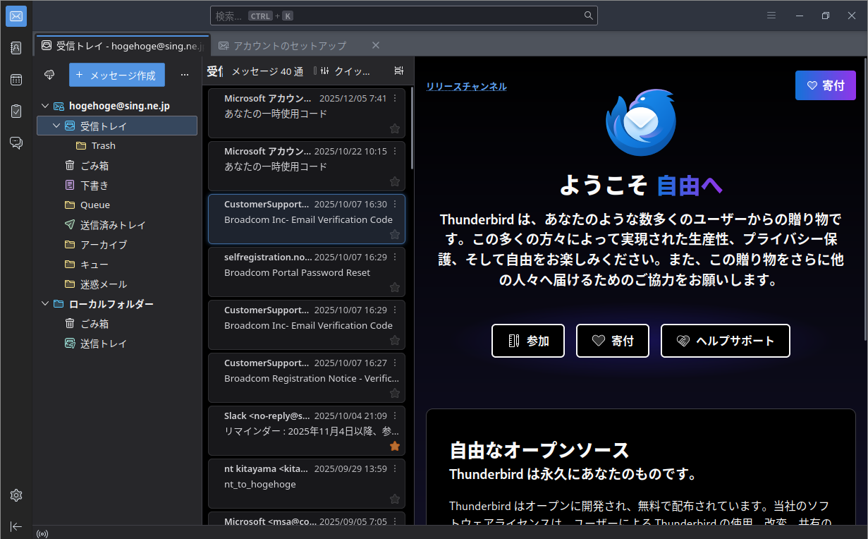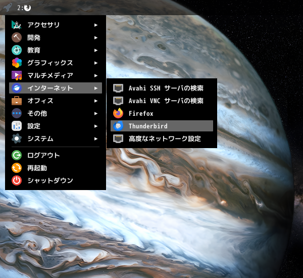 1. 概要 デフォルトでは、メールクライアントは、インストールされていません。 「Thunderbird」をインストールして、使用します。 「メールアアドレスのセットアップ」他、操作については、「メール クライアント ソフト - Thunderbird」をご参照ください。 2. インストール 「root」ユーザ権限で。 yes | pacman -S thunderbird-i18n-ja 3. 起動 「スタート」→「インターネット」→「Thunderbird」
