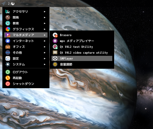 1. 概要 マルチメディアプレイヤーとして、「SMPlayer」を使用します。 2. インストール 「root」ユーザ権限で。 yes | pacman -S smplayer 3. 起動 「スタート」→「マルチメディア」→「SMPlayer」